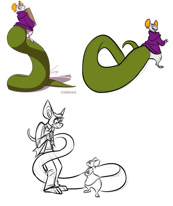 It's been a hot minute since I drew my monster man, Xavier! So in celebration of #MacroMarch, here's a scene from mine and @/thedandyray's roleplay shenanigans! Featuring Dominic (Who is currently being toyed with by Xavier) and Kenny (who is pinned by Xav's tail)
