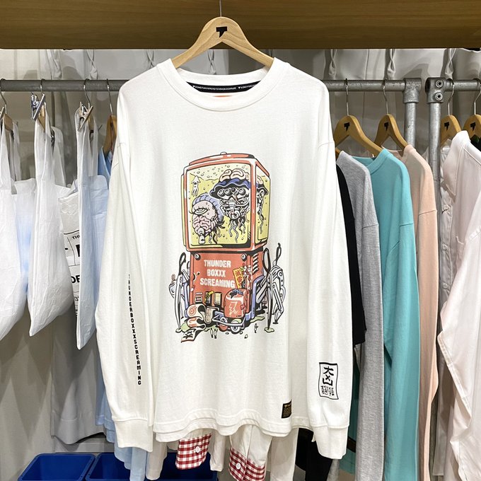 https://t.co/ixcibqjAhA イラストレーター『シモダヨウジ(INC NOXXX SCREAMING)』による描き下ろしイラストが怪しく異彩を放つロングスリーブTシャツ。袖のプリントは大凶ではなく大メ出たい。今の季節はショーツと合わせたコーディネートもおすすめです。