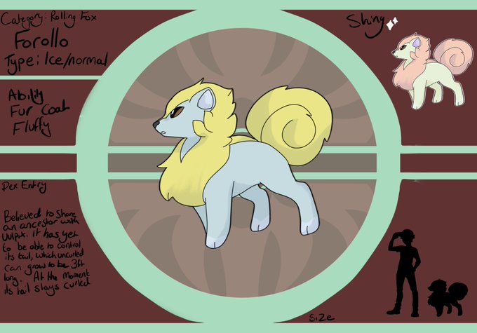 #TrueGreen7redesign3 Meet Forollo! The Rolling Fox Pokémon, an Ice/Normal type with the abilities fur coat or fluffy, it’s tail can uncurl to be about 3ft long, but it is not yet able to control it, it is thought to share an ancestor with Vulpix.