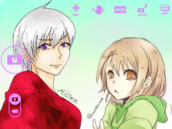 最後はウォーしゃん事務所(@mizunowater )の冬羽くんと襲くんに我が家の双子たちと並んでもらいました!シンプルに自撮りっぽく!冬羽くんとカナメ、襲くんとカナヤです!