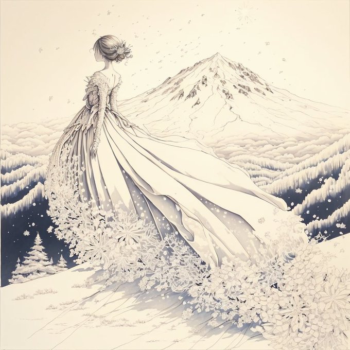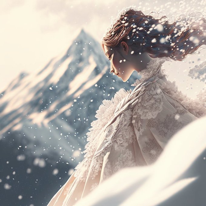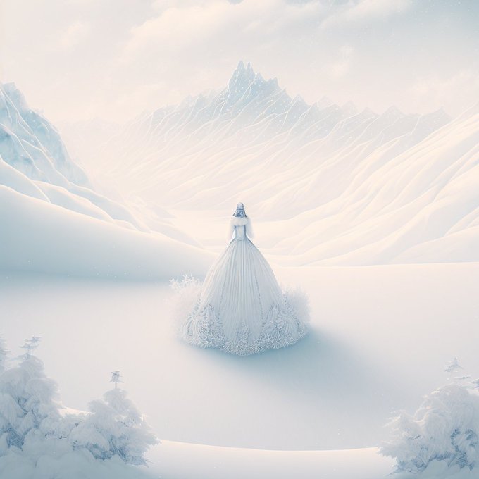 #ファンタジー #雪 #冬 #光 #結晶 #幻想 #神秘 #ドレス #winter #snow #whitesnow #pure #distance #fantasy #beautiful #wonderful #snowmountain #forest #dress #woman #whitedress #midjourney #AIイラスト