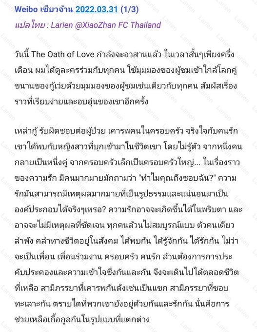 "#TheOathOfLove กำลังจะมาถึงบทสรุปที่ประสบความสำเร็จในวันนี้ ในเวลาเพียงครึ่งเดือน ผมได้ชมละครพร้อมกับทุกคน เข้าใกล้โลกคู่ขนานของ Gu Wei จากมุมมองของผู้ชมเหมือนทุกคน และรู้สึกถึง "Gu" ที่เรียบง่ายและอบอุ่นของเขาอีกครั้ง"#XiaoZhanxGuwei