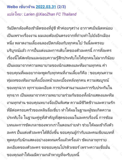 เซียวจ้านก็มาอัพเว่ยขอบคุณผู้กำกับทีมงานทุกคนและหลินจือเซี่ยวหรือน้องจื่อของเราด้วยรูปของจ้านน่ารักและใส่ใจมากเลย