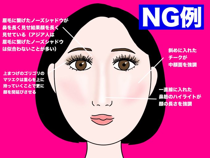 目の位置が高め、中観面が長めの人のチークの入れ方を質問をいただいたので、イラストにしちゃいました!とにかく『下方向に持っていく』のが鍵です✨